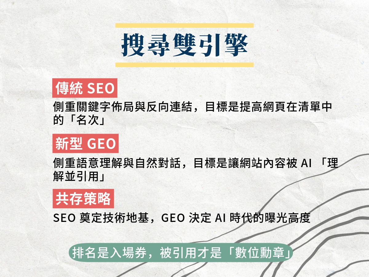 | 成功關鍵 | 技術 SEO、EEAT、內容深度 | 內容可信度、結構化資料、品牌權威性 |