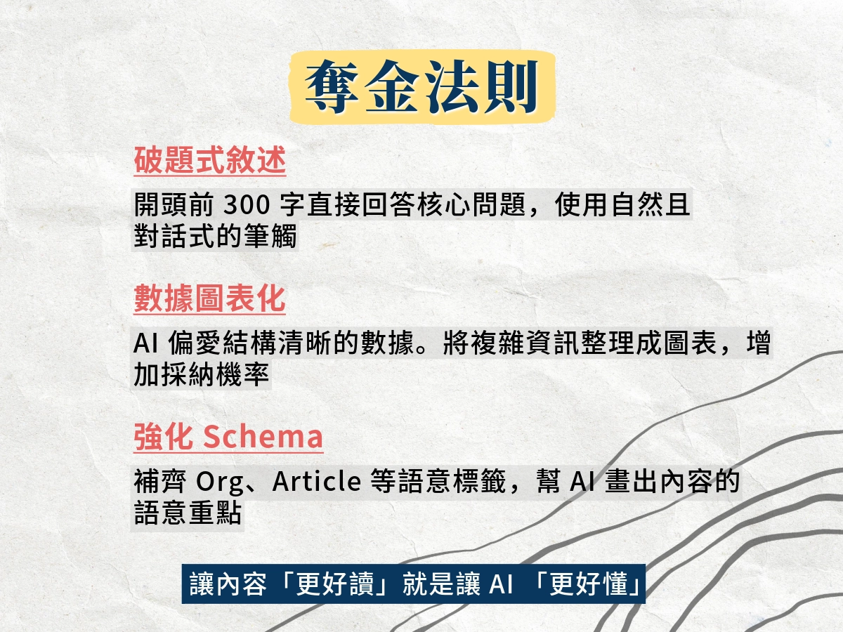 - 能不能被擷取:段落結構與資料格式是否容易被模型抓到關鍵點。