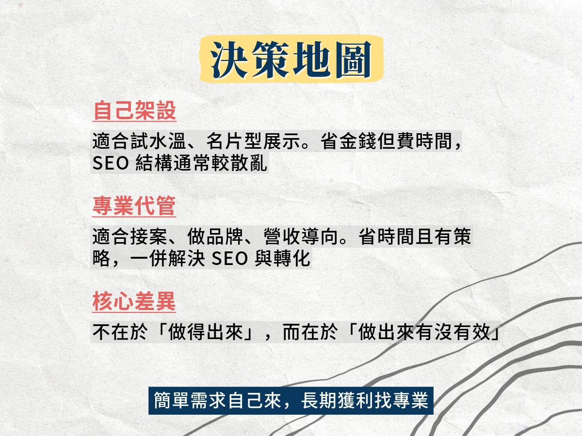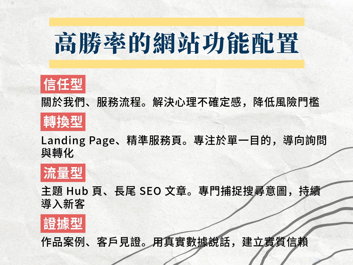 - 內容與呈現:服務怎麼說明、案例怎麼放、FAQ 怎麼寫才回答到痛點。