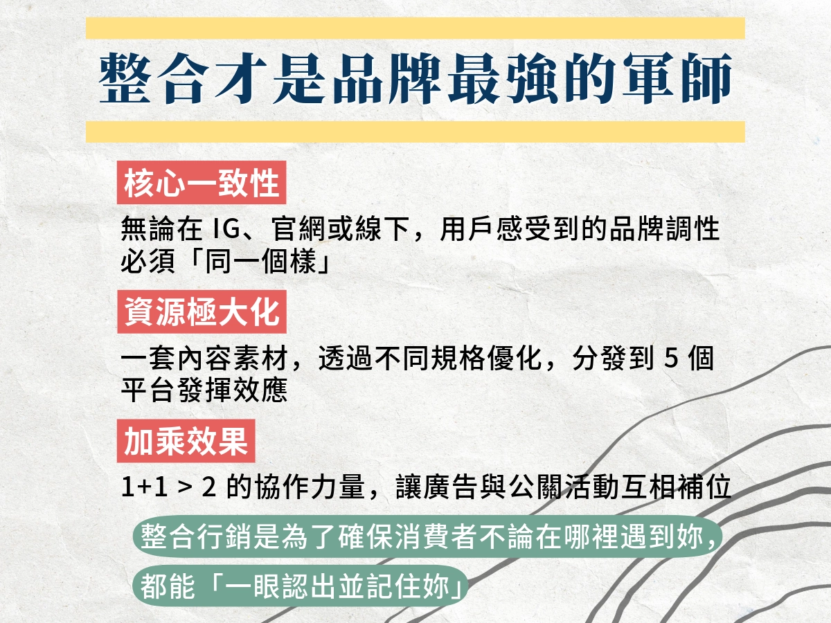 整合行銷不單純只是多找幾個管道發文而已,而是線上、線下的整合,同時完全貼近品牌,進而提升品牌知名度並創造實質收益。