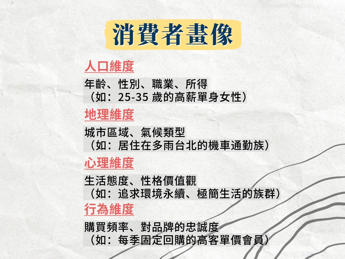 - 行為特徵:購買頻率、品牌忠誠度、使用場合。