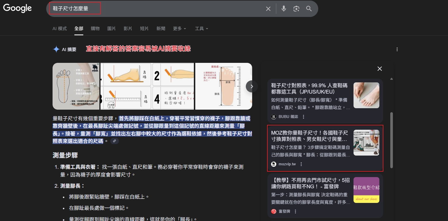 使用者現在問的問題越來越具體、情境越來越多元,不只是「關鍵字」而是「完整一句話的提問」。像這樣的問題更容易被 AI 摘要處理。