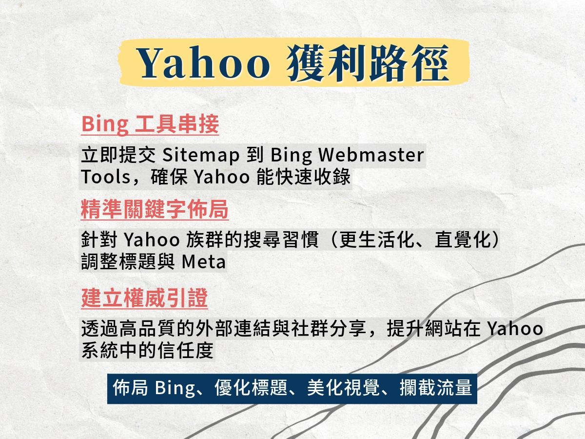 Yahoo 偏好「關鍵字密度較高」、「HTML 清楚」、「頁面簡單」,應針對 Yahoo 搜尋生態,調整內容結構與關鍵字策略。